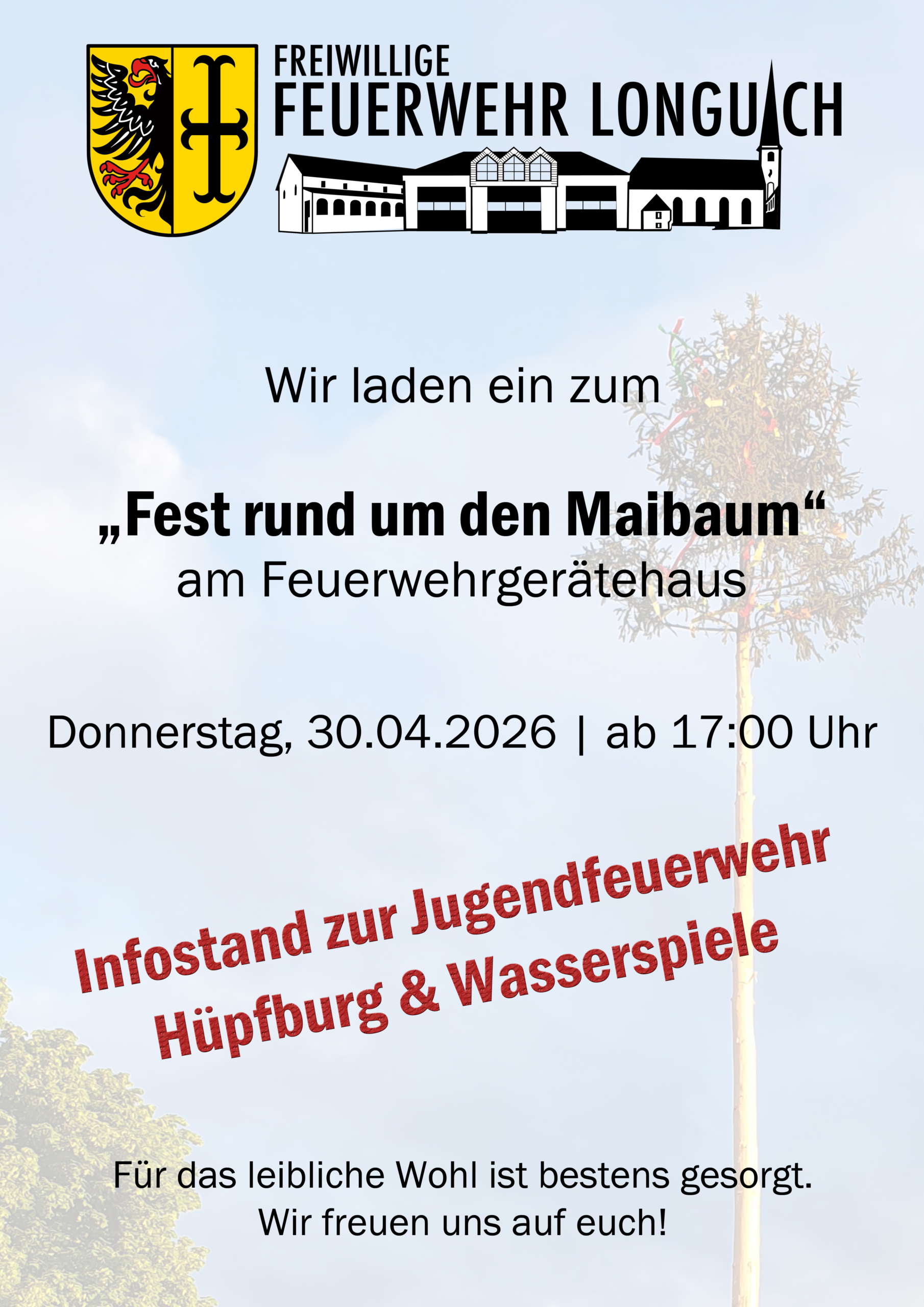 Der Verein der Freiwilligen Feuerwehr Longuich-Kirsch lädt ein zum Fest „Rund um den Maibaum“ am Donnerstag, 30.04.2026. Für das leibliche Wohl sowie Spiel und Spaß für Kinder ist bestens gesorgt. Los geht es ab 17:00 Uhr am Feuerwehrgerätehaus in Longuich – der Maibaum wird am frühen Abend aufgestellt. Wir freuen uns auf Ihren Besuch!